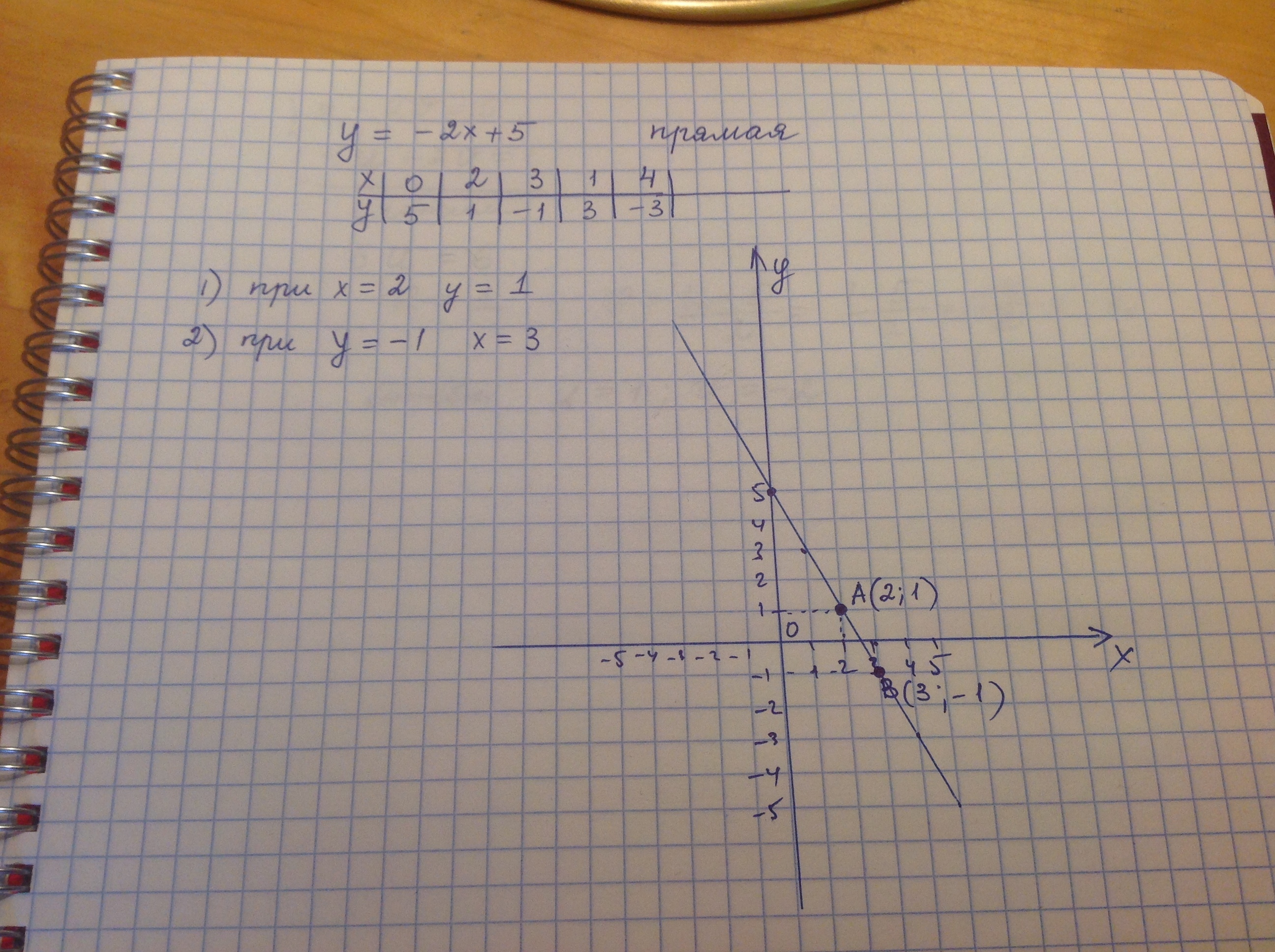 Постройте график функции y= -2x + 5. Пользуясь графиком, найдите: 1)значение функции, если значение аргумента равно 2; 2)значение аргумента, при котором значение функции равно -1. желательно с чертежом 46 баллов