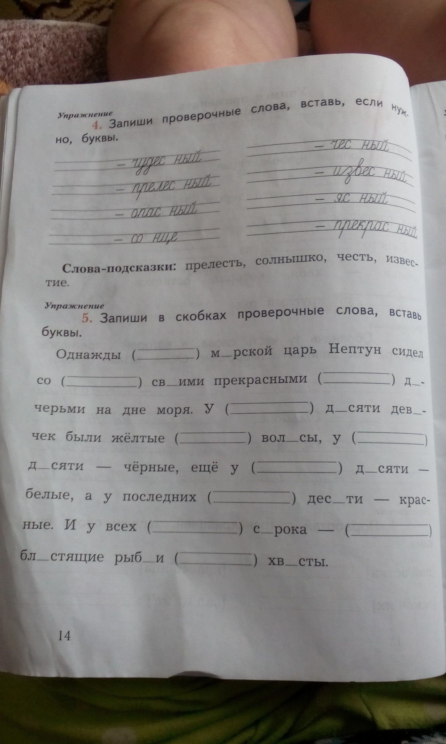 5. Однажды (мОре) мОрской царь сидел со (свОй) свОими прекрасными (дОчь) дОчерьми на дне моря. У (дЕсять) дЕсяти девОчек были жёлтые (волОс) волОсы, у (дЕсять) дЕсяти - черные, еще у (дЕсять) дЕсяти - белые, а у последних (дЕсять) дЕсяти - красные. И у всех (сОрок) сОрока (блЕск) блЕстящие рыбЬи (хвОст) хвОсты.