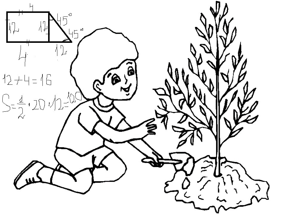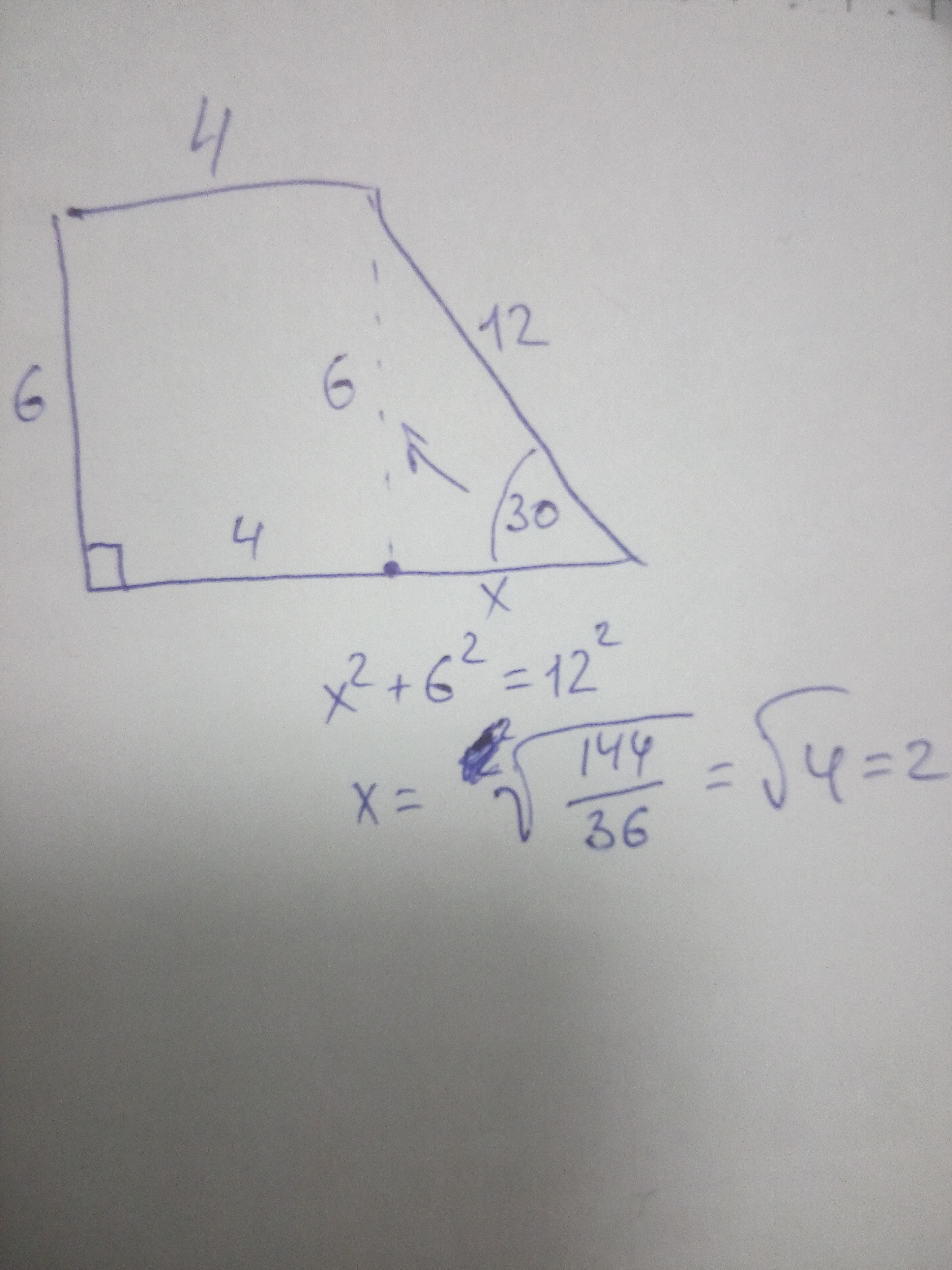 опускаешь высоту, получаем прямоугольник и треугольник, узнаём один катет, равен половине гипотенузы, из этого узнаём второй