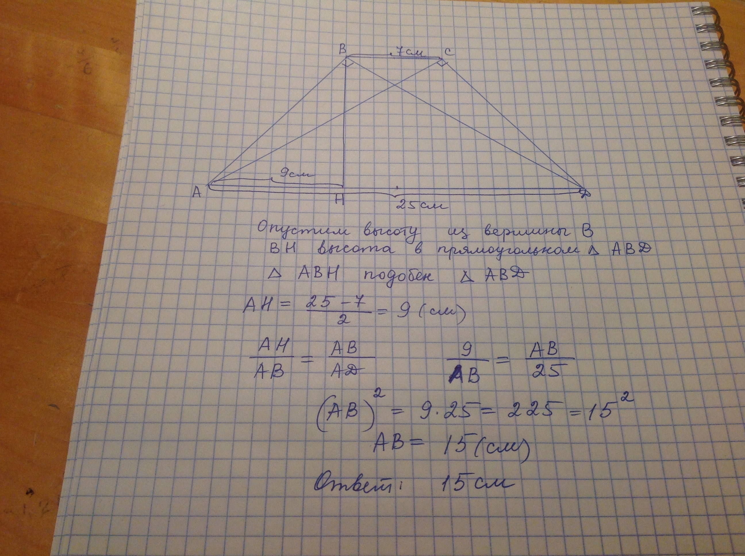 Найдите боковую сторону равнобокой трапеции, осования которой равны 7 см и 25 см, а диагонали перпендикулярны боковым сторонам.