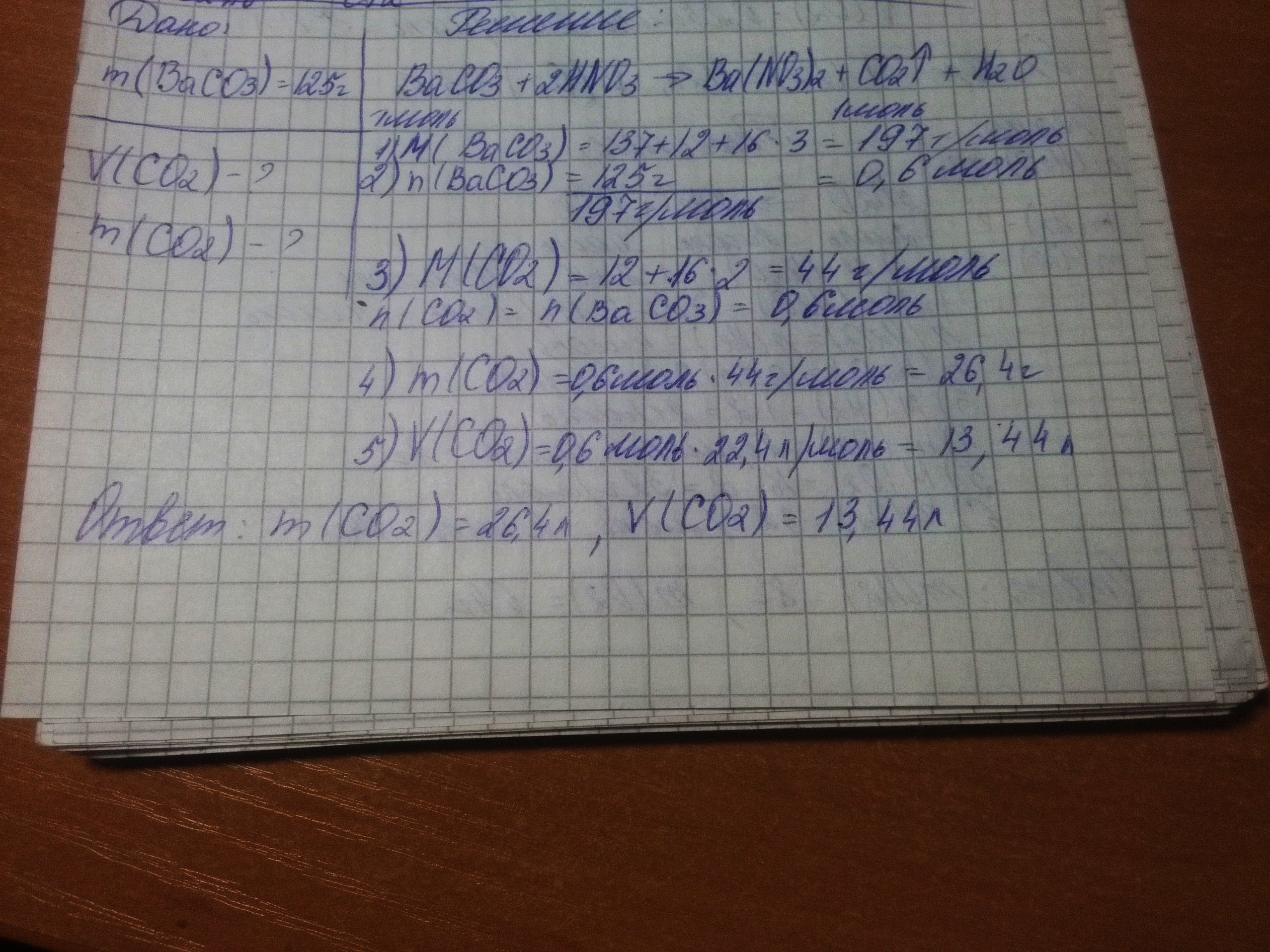 найти массу и объём углекислого газа полученного при взаимодействии 125г карбоната бария с азотной кислотой?