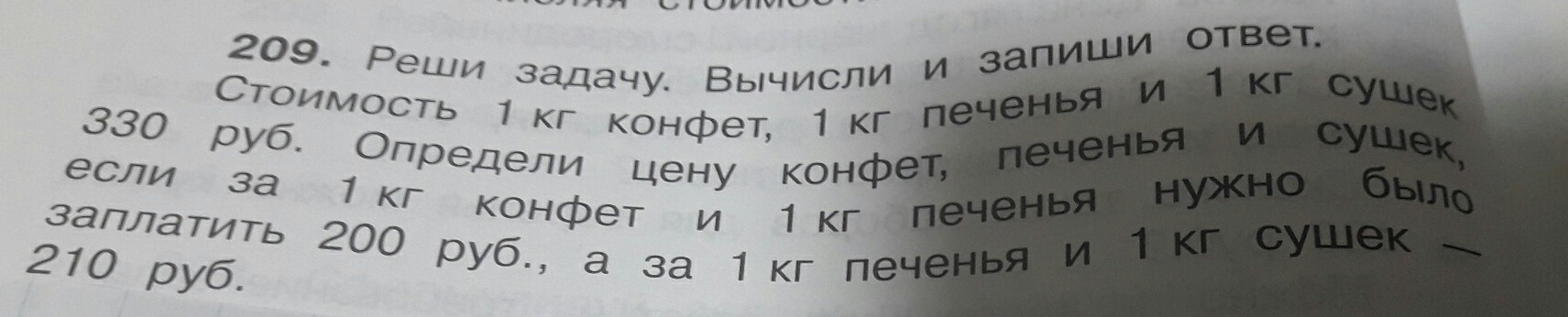 стоимость 1 кг конфет, 1кг печенья, и 1 кг сушек 330 рублей. Определи цену конфет, печенья и сушек, если за 1 кг конфет, и 1 кг печенья нужно было заплатить 200 рублей, а за 1 кг печенья и 1 кг сушек - 210 рублей