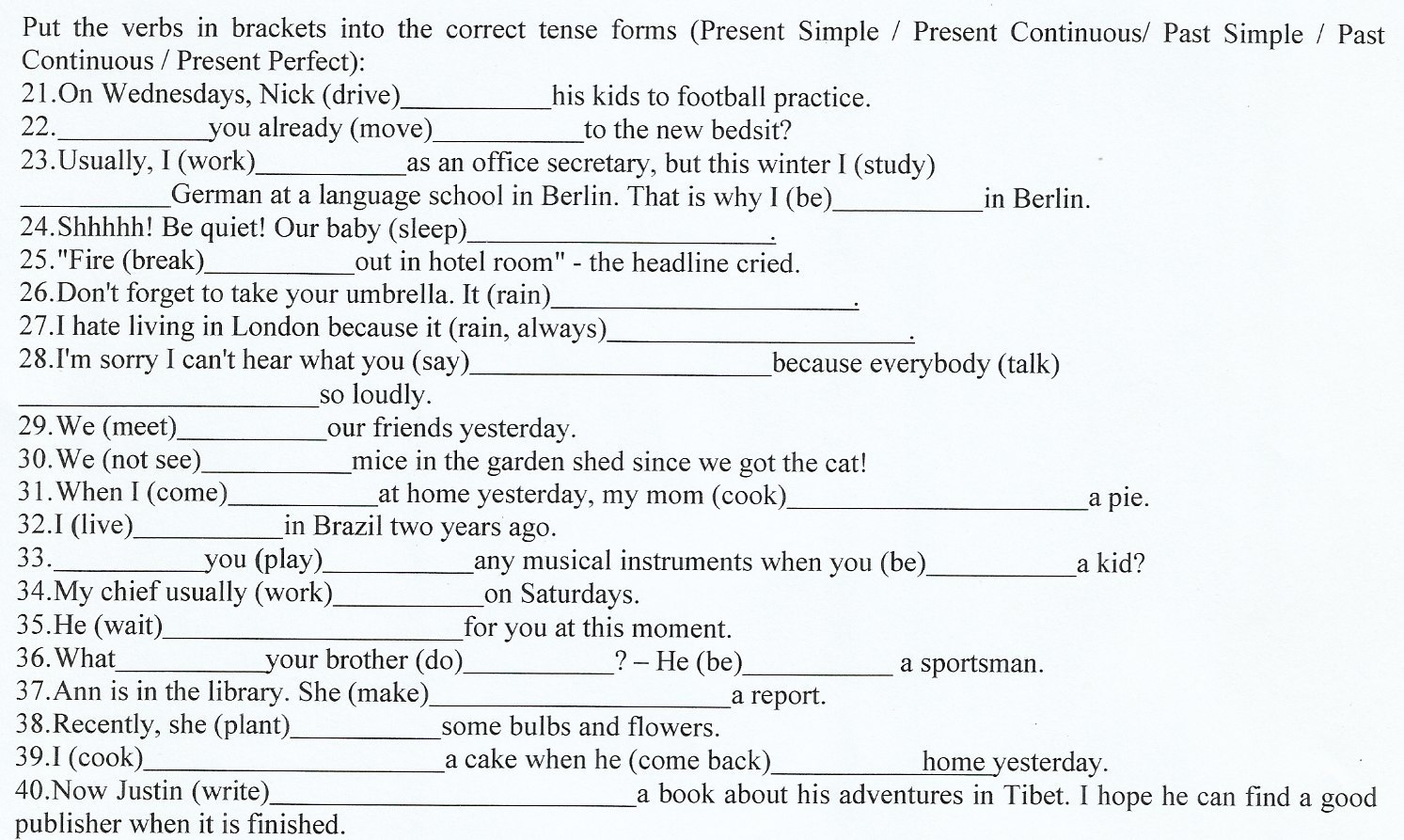 21 drives 22 Have … moved 23 work … am studying …. I am in Berlin 24 is sleeping 25 breaks 26 is raining 27 is always raining 28 are saying … is talking 29 met 30 haven’t seen 31 came … was cooking 32 lived 33 Did you play ….were 34 works 35 is waiting 36 What does your brother do? …is 37 is making 38 has planted 39 was cooking … came 40 is writing
