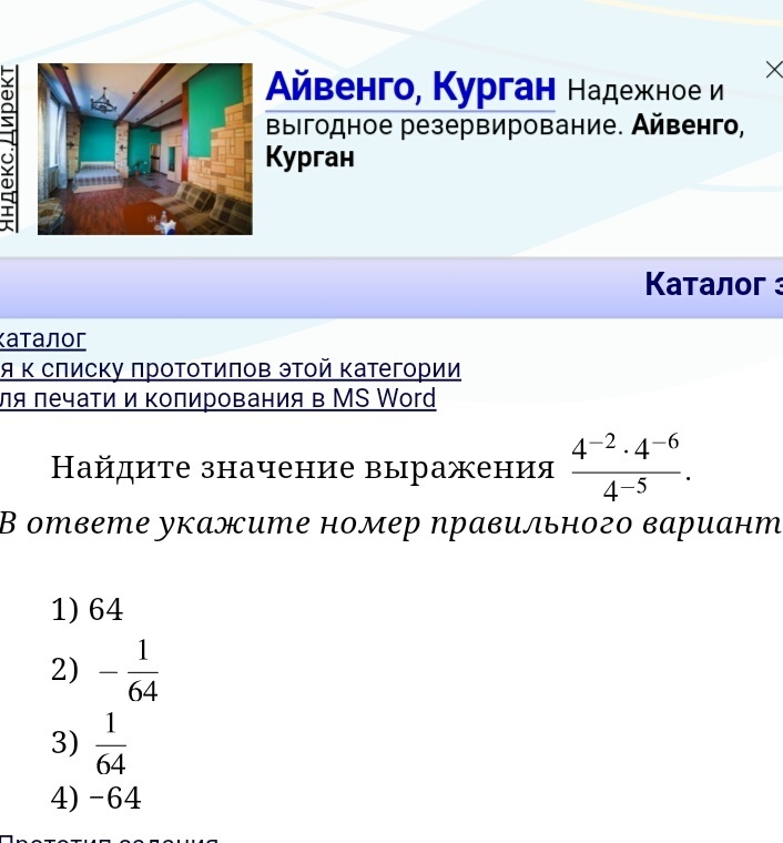4^(-2)*4^(-6)/4^(-5)=4^(-8)/4^(-5)=4^(-3)=1/64. правильный вариант: цифра 3.