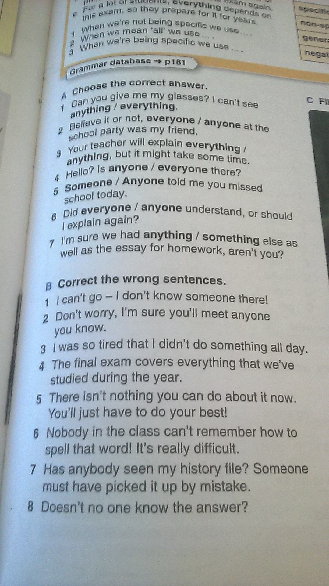 B - anyone вместо someone, somebody вместо anyone, anything вместо something, в 4 все верно, anything вместо nothing, в шестом и седьмом все правильно, anyone вместо no one