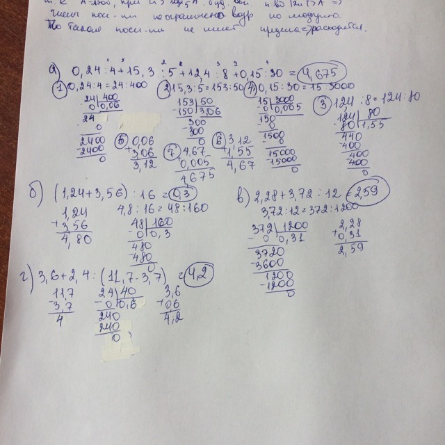 Найдите значения выражения: a)0,24:4+15,3:5+12,4:8+0,15:30; б)(1,24+3,56):16; в)2,28+3,72:12; г)3,6+2,4:(11,7-3,7). Пожалуйста действия в столбик
