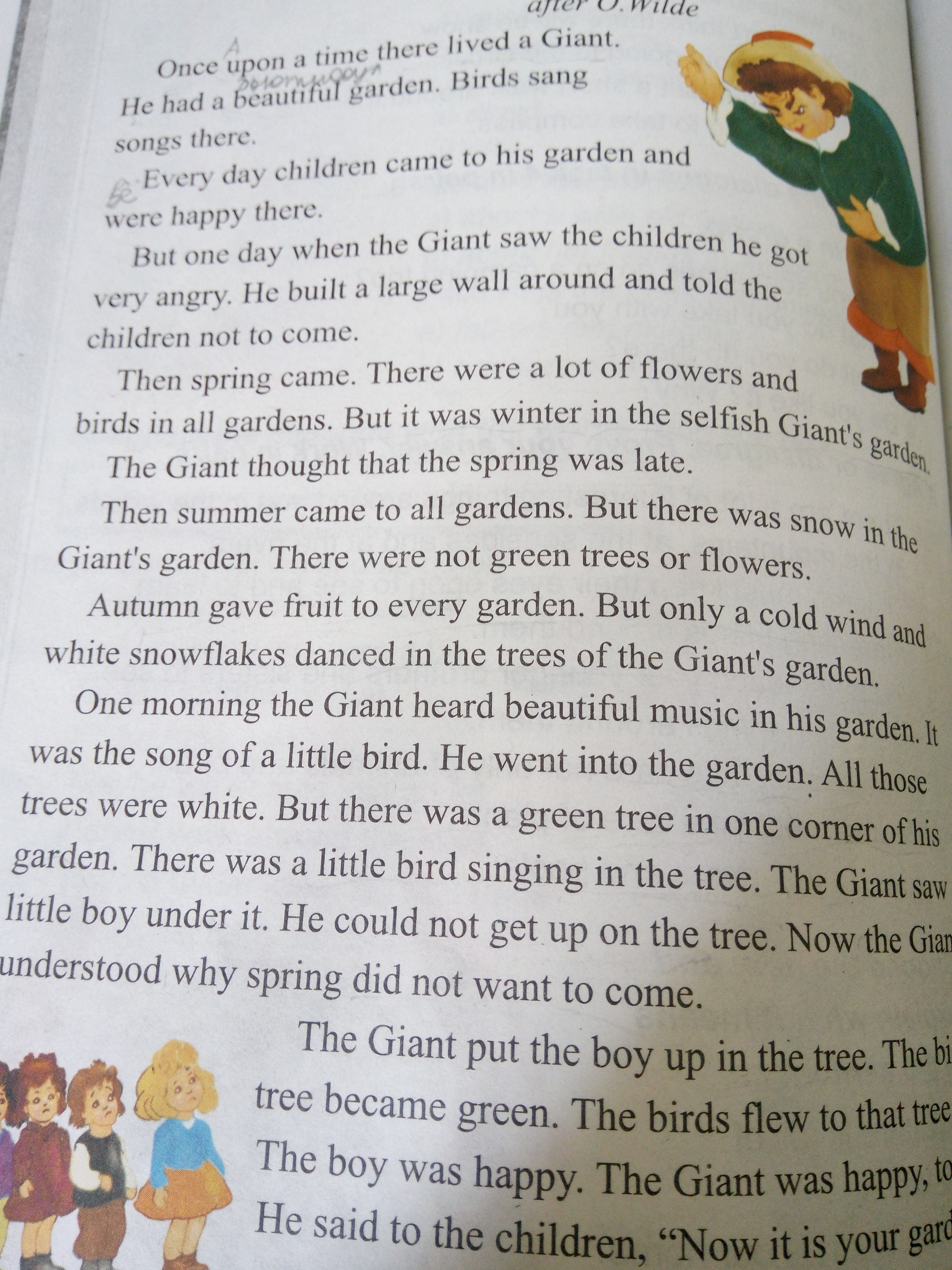 Когда-то жил великан. У него был красивый арден. Птицы пели песни там свой сад и каждый день дети приходили, чтобы были счастливы там дети. Но однажды, когда Великан увидел расслышав это очень рассердился. Он построил большую стену и детей, чтобы не приходили. Затем наступила весна. Во всех садах было много цветов и птиц. Но это была зима в эгоистичных гигантах. Великан думал, что весна запоздала. Тогда лето пришло ко всем садам. Но в саду Гиганта был снег. Не было зеленых деревьев и цветов. Осень дала плоды каждому саду. Но только холодный wi и белые снежинки танцевали на деревьях сада гигантов. Однажды утром великан услышал прекрасную музыку, а песня маленькой птички. Он пошел в сад. Все эти деревья были белыми. Но в одном углу сада было зеленое дерево. На дереве была маленькая птичка. Гигант увидел маленького мальчика под ним. Он не мог встать на дерево. Теперь Джиам понял, почему весна не захотела прийти. Гигант посадил мальчика на дерево. Би дерево стало зеленым. Птицы полетели к этому уе. Мальчик был счастлив. Гигант был счастлив, он сказал детям. Ты, это твой гард
