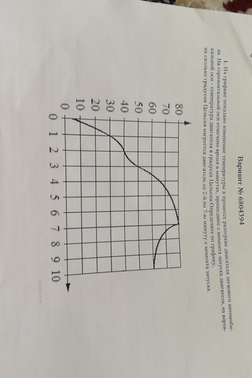 на графике показано изменение температуры в процессе разогрева двигателя легкового автомобиля на горизонтальной оси отмечено время в минутах прошедшее с момента запуска двигателя на вертикальной оси температура двигателя в градусах Цельсия Определите По графику на сколько градусов Цельсия нагреется двигатель со 2 по 7 минут с момента запуска