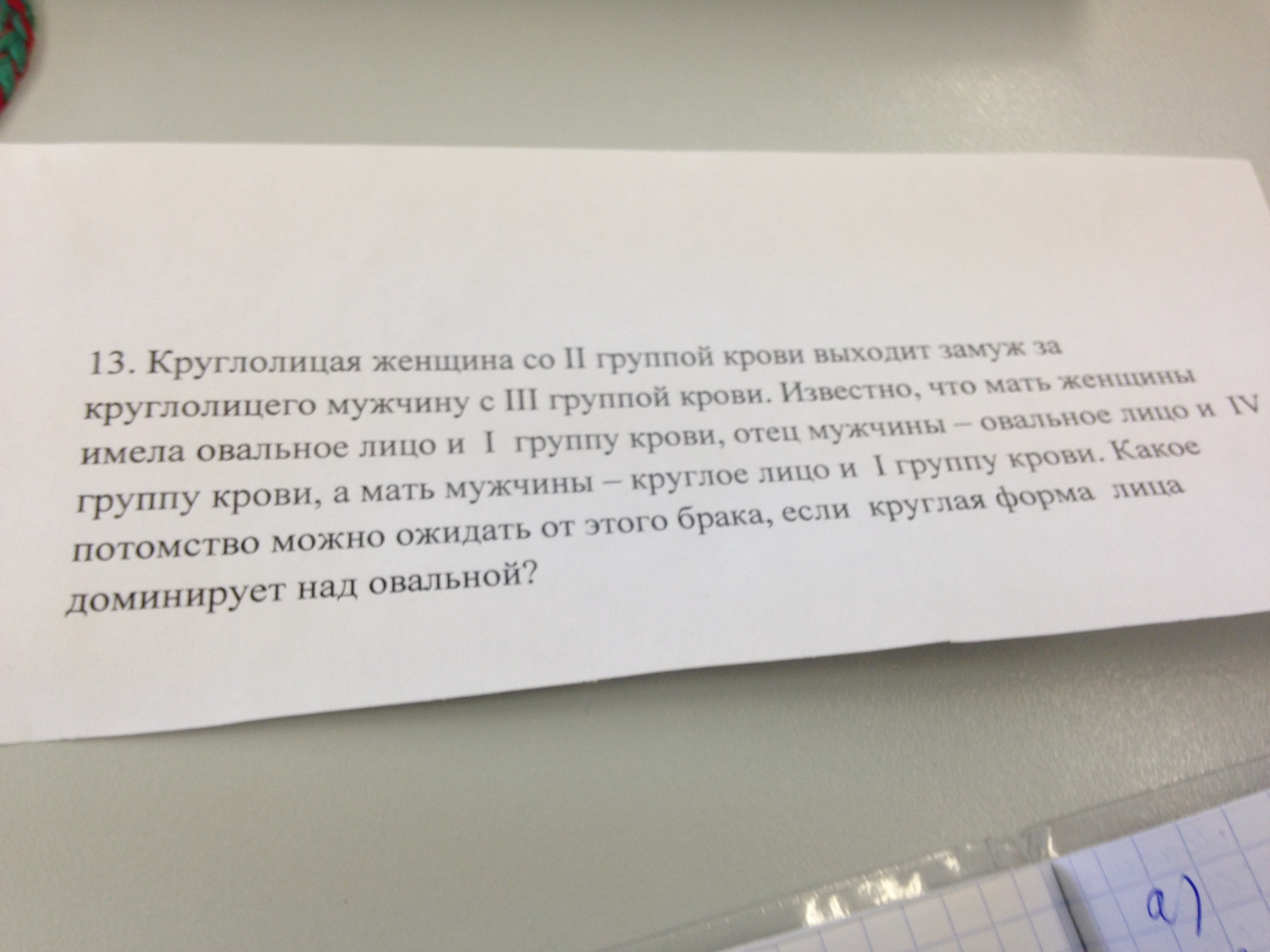 ♂АаI(B)I(0) х ♀АаI(A)I(0) = АаI(B)I(0) - круглое лицо третья группа крови, АаI(А)I(0) - круглое лицо вторая группа крови, АаI(А)I(В) - круглое лицо четвертая группа крови, АаI(0)I(0) - круглое лицо первая группа крови, ААI(B)I(0) - круглое лицо третья группа крови, ААI(А)I(0) - круглое лицо вторая группа крови, ААI(А)I(В) - круглое лицо четвертая группа крови, ААI(0)I(0) - круглое лицо первая группа крови, ааI(B)I(0) - овальное лицо третья группа крови, ааI(А)I(0) - овальное лицо вторая группа крови, ааI(А)I(В) - овальное лицо четвертая группа крови, ааI(0)I(0) - овальное лицо первая группа крови.