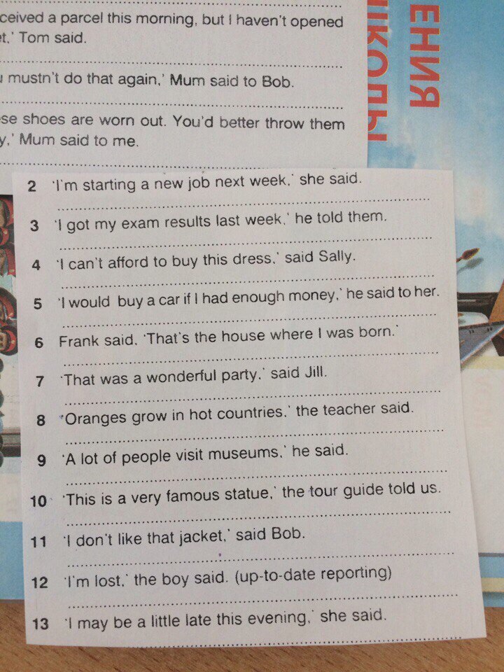 Вот смотрите. Первое предложение делится на две части. Сама речь и вторая часть-тот, кто Ее говорит. Я все написала, ваша задача лишь состоит в том, чтобы дописать предложение( а именно вот эту 1 часть, я же начала писать, вам просто нужно продолжить) вот, например, в первом предложении я закончила на starting, вам остаётся дописать: a new job next week))
