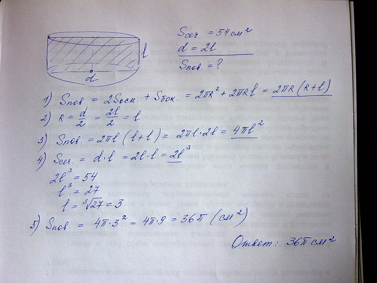 площадь осевого сечения цилиндра равна 54 см в квадрате.а его образующая в 2 раза меньше диаметра основания.Найти площадь полной поверхности цилиндра.