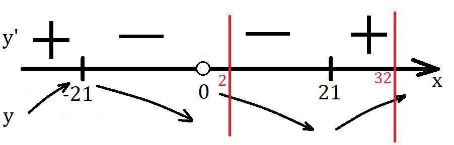 При x∈[2;21] функция убывает; при х∈[21;32] функция возрастает. Поэтому наименьшее значение будет при х=21.
