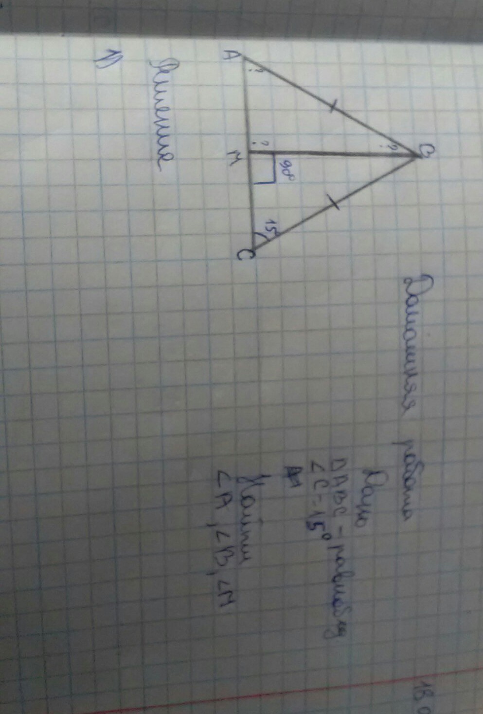 1) угол А равен 15(т.к треугольник АВС равнобедренный, а АВ=ВС)