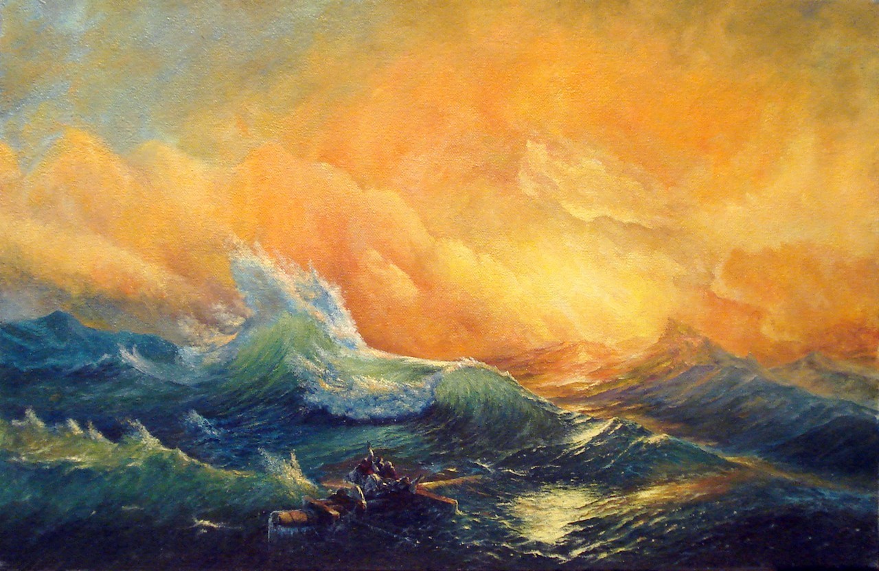 На небе одинокое солнце пытается пробиться через множество облаков и миллионы брызг от волн. Небо сделано в технике мазок маслом. Автор мазок за мазком клал масло выписывая бордовое и слегка розовое закатное небо. на переднем плане изображены моряки, потерпевшие крушение своего корабля. они пытаются пробиться сквозь большие волны. бесконечное море и грозные, большие волны так и хотят забрать их с собой на морское дно.
