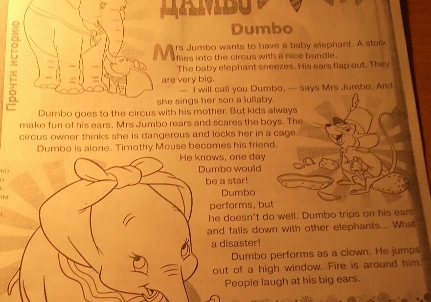 ДамбоМиссис Джамбо хочет иметь слоненка. Аистлетит в цирк с хорошим пакетомСлоненок чихает его уши двигаются. Ониочень большиеЯ буду называть тебя Дамбо, - говорит миссис Джамбо. Иона поет сыну колыбельную.Дамбо идет в цирк с мамой. Но дети всегдасмеются над его ушами. Миссис Джамбо рычит и пугает мальчиков. Ахозяин цирка считает, что она опасна и запирает ее в клетке.Дамбо один. Тимоти мышь становится его другомОн знает, однаждыДамбо будет звездой!Дамбо выступает, ноон не очень хорошо. Дамбо играет с ушами.Но вот катастрофа!Дамбо ведет себя как клоун. Он прыгаетиз высокого окна. Огонь вокруг него.Люди смеются над его большими ушами.