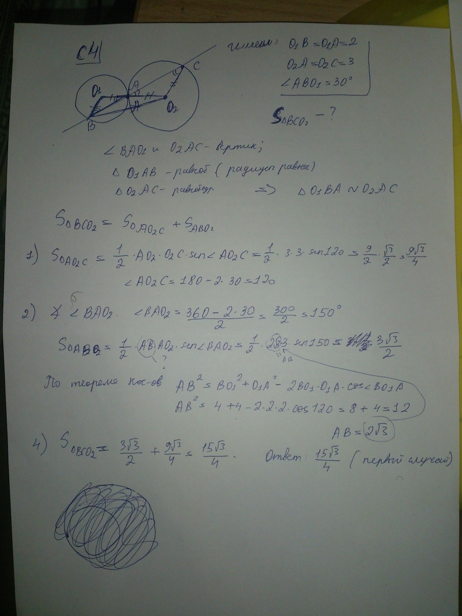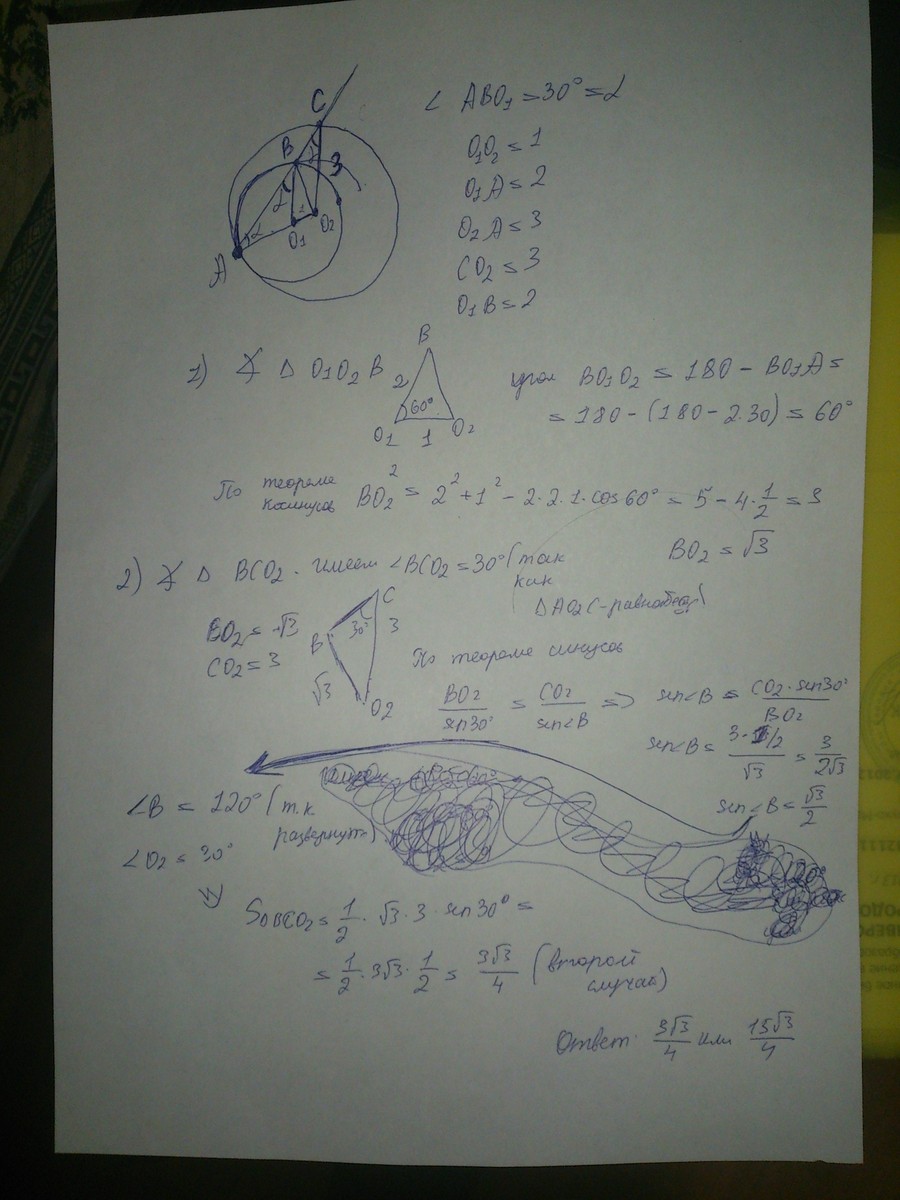 окружности радиусов 2 и 3 с центрами О1 и О2 соответственно касаются в точке А,вторично пересекает меньшую окружность в точке В, а большую в точке С. Найдите площадь треугольника BCO2, если угол АВО1=30 градусов