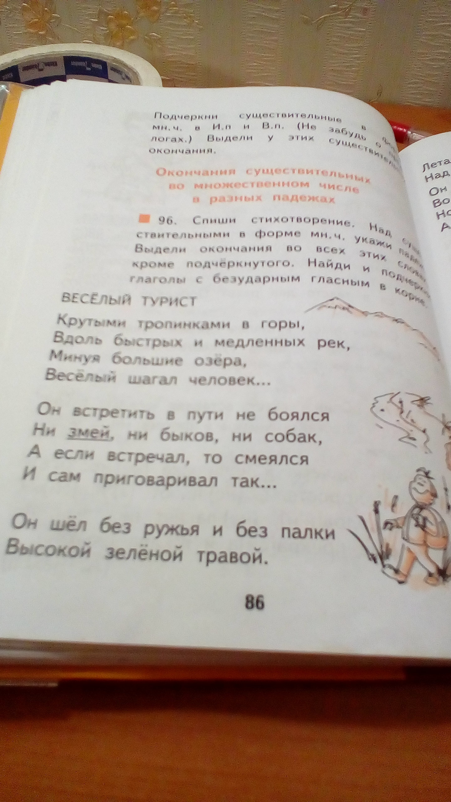 Существительные: тропинк(ами) (Т. п.), в гор(ы) (В. п.), рек( )(Р. п.), озер(а) (В. п.), змей (Р. п.), бык(ов) (Р. п.), собак( )(Р. п.), кукушк(и) (И .п.), галк(и) (И. п.), по троп(ам) (Д. п.), дорог(ам) (Д. п.), волк(ов) (В. п.), медвед(ей) (В. п.).