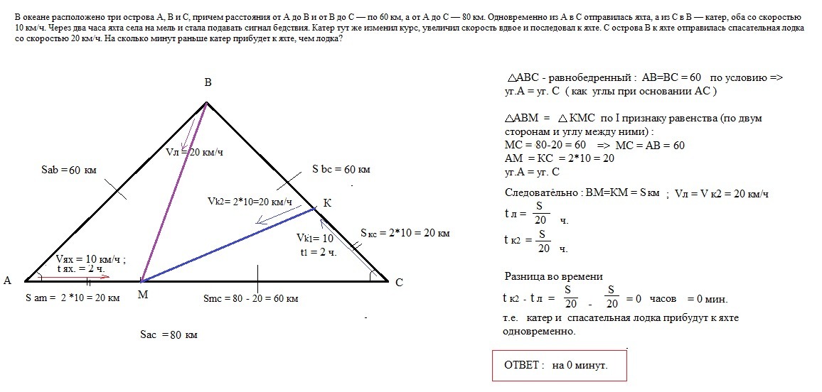 В океане расположено три острова AA, BB и CC, причем расстояния от AA до BB и от BB до CC — по 60 км, а от AA до CC — 80 км. Одновременно из AA в CC отправилась яхта, а из CC в BB — катер, оба со скоростью 1010 км/ч. Через два часа яхта села на мель и стала подавать сигнал бедствия. Катер тут же изменил курс, увеличил скорость вдвое и последовал к яхте. С острова BB к яхте отправилась спасательная лодка со скоростью 2020 км/ч. На сколько минут раньше катер прибудет к яхте, чем лодка?