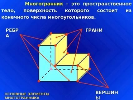 Многогранник - геометрическое тело, ограниченное со всех сторон плоскими многоугольниками, называемыми гранями. Стороны граней называются ребрами многогранника, а концы ребер — вершинами многогранника.