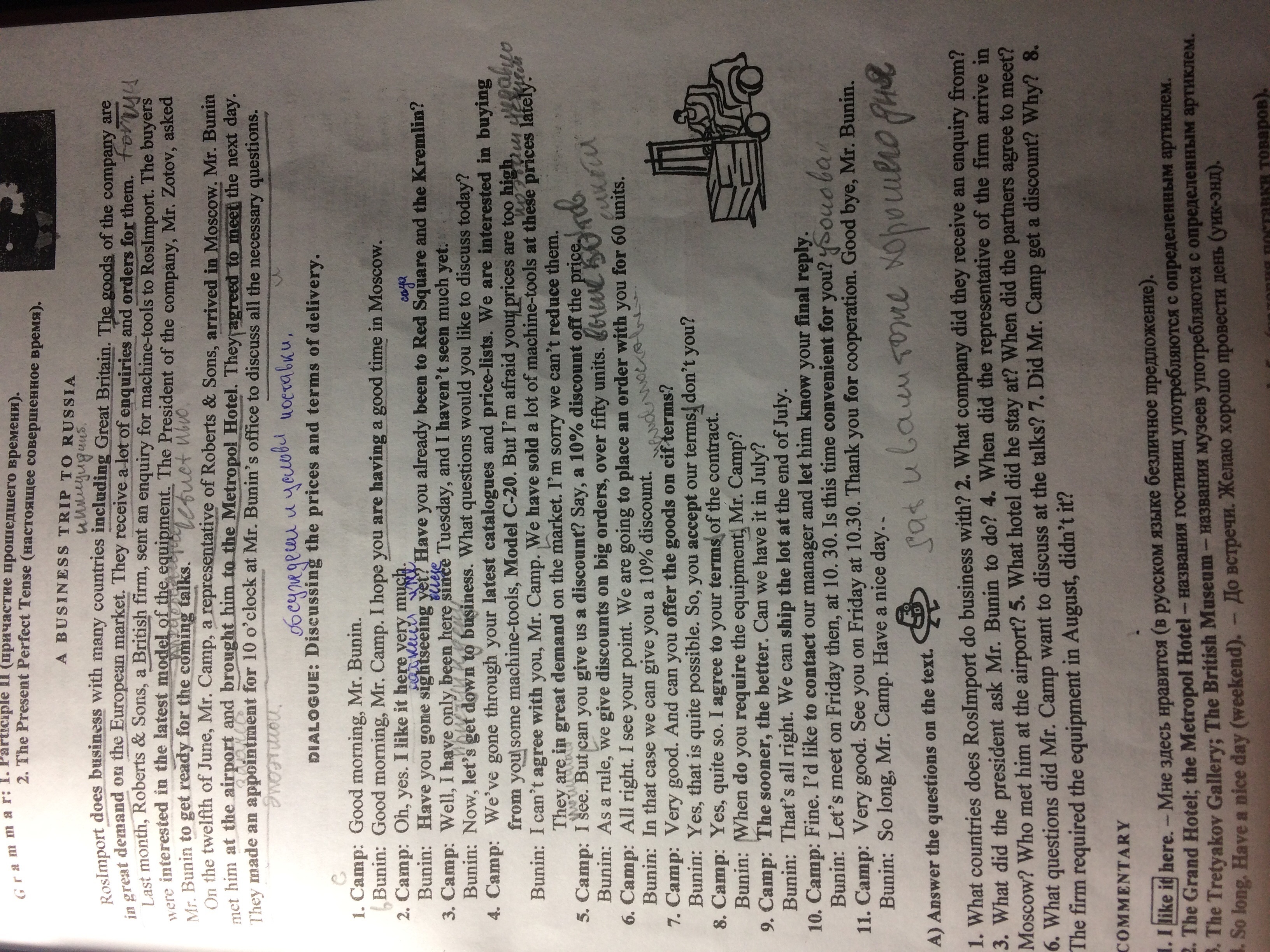 Лагерь: Доброе утро, г-н Бунин.Бунин: Доброе утро, г-н лагерь. Вы не садитесь? 2Лагерь: Спасибо.Бунин: Есть сигареты? 3Лагерь: Нет, спасибо. Не курю.Бунин: Как вы, г-н лагерь?Лагерь: очень хорошо, спасибо. И как ты?Бунин: я тоже хорошо. Что может сделать для вас, г-н лагерь?Лагерь: Ну, вы видите, 4Mr. Бунин, я здесь, чтобы сделать контракт с вамидля котлов.Бунин: Очень хорошо. Сколько котлы вы хотели бы купить?Лагерь: Четыре или пять котлов. Может у меня есть ваши каталоги и прайс листы?Бунин: Да, конечно. Здесь вы областиЧасы работы v г-н Бунин начинаются в 9 часов, но он, как правило, приходит в офис в четверти до девяти, чтобы получить готовый к работе. В 9 часов секретарь приносит ему почту. Он проходит через улучшается, Кабели и телексы и отправляет ответы на иностранные фирмы или их телефоны. Он иногда получает иностранные бизнесмены из Великобритании, Франции, Германии и других стран. Они обычно обсуждают цены, условия оплаты и доставки.В половине прошлом один г-н Бунин имеет ужин. После обеда он иногда встречается с директорами или инженерами наших заводов. Он заканчивает работу в 5 часов в послеобеденное время.