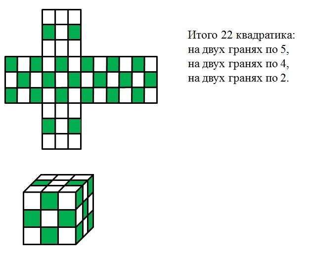 Каждая грань куба разделена на девять квадратиков. Какое самое большое число квадратиков можно покрасить, чтобы никакие два покрашеных квадратика не имели общей стороны?