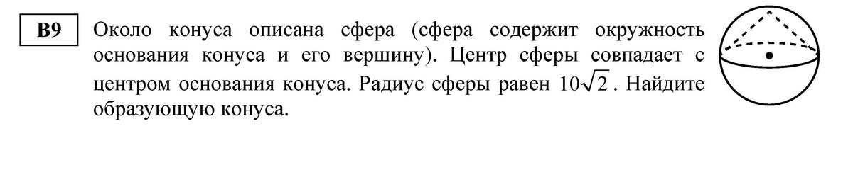 Около конуса описана сфера (сфера содержит окружность основания конуса и его вершину). Центр сферы совпадает с центром основания конуса. Радиус сферы равен 10 корней из 2. Найдите образующую конуса.