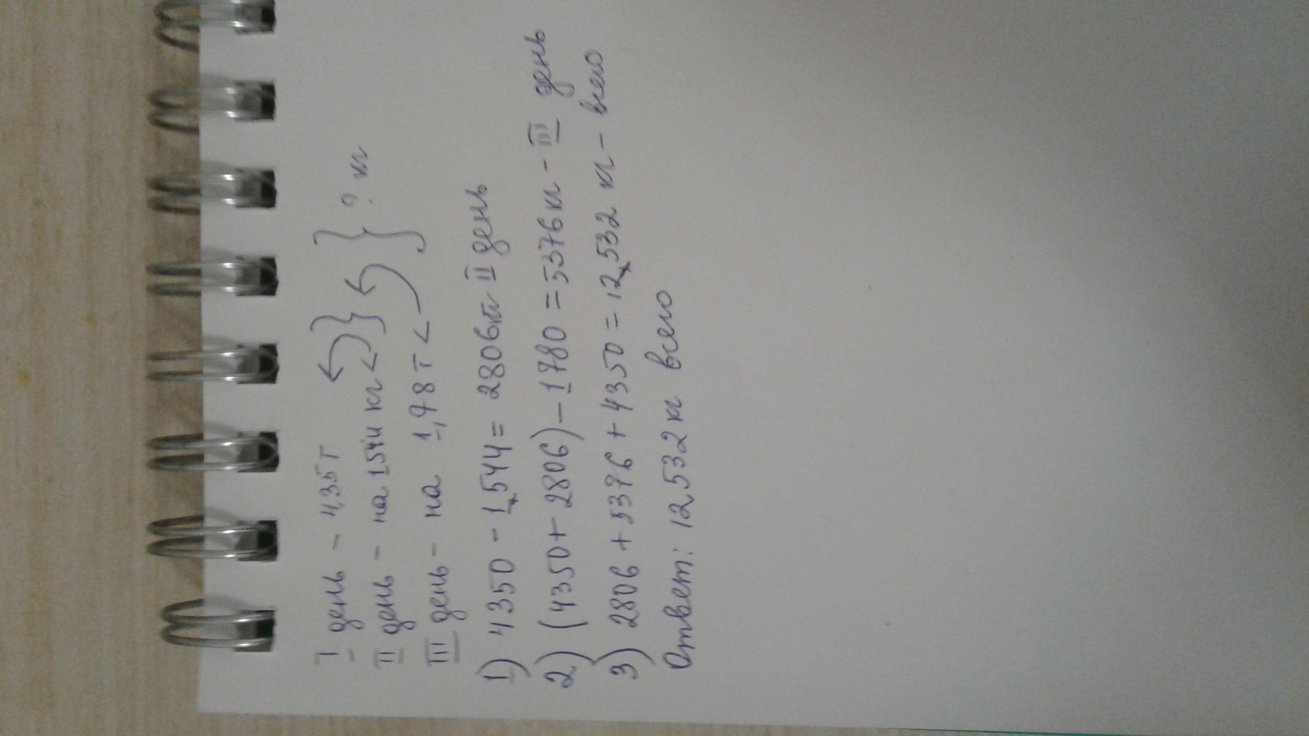 пекарня в первый день израсходовала 4,35 тонн муки , а в второй день на 1544 кг меньше , а в третий на 1,78 тонн меньше чем во второй и в первый день вместе . Сколько тонн муки было израсходовано за три дня ?