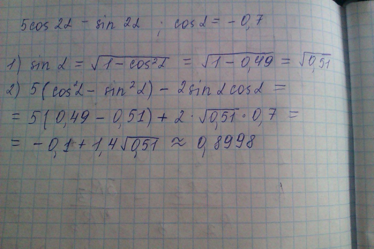 Значит, 5cos^2a-1+cos^2a=6cos^2a-1. Если cosa=-0,7, то данное выражение равно 1,94