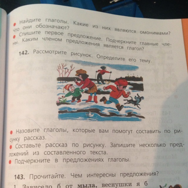 Рассомтрите рисунок. Определите его тему. Назовите глаголы, которые вам помогут составить по рисунку рассказ. Составьте рассказ по рисунку. Запишите несколько предложений из составленного текста. Упражнение номер 142