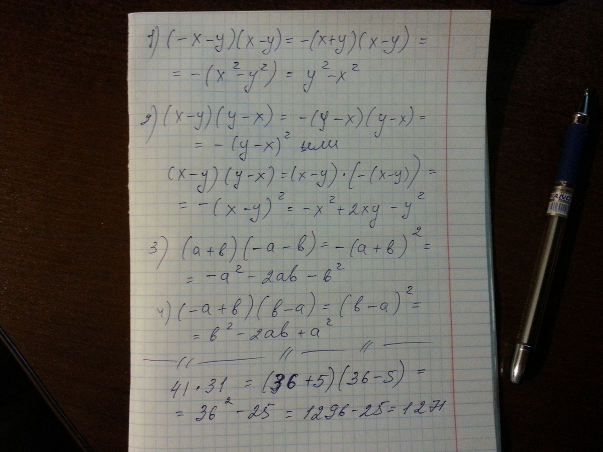 представьте в виде многочлена: (-х-у)(х-у) , (х-у)(у-х) , (a+b)(-a-b) , (-a+b)(b-a)