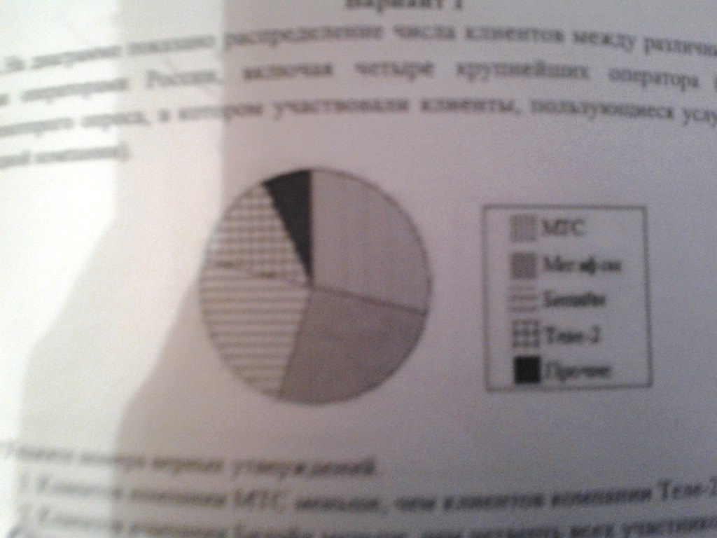 На диаграмме показано распреление числа клиентов можду различными сотовыми операторами Росии,включая четыре крупнейших оператора ( по данным некоторого опросв, в котором участвовали клиенты, пользующиеся услугами только одной компании