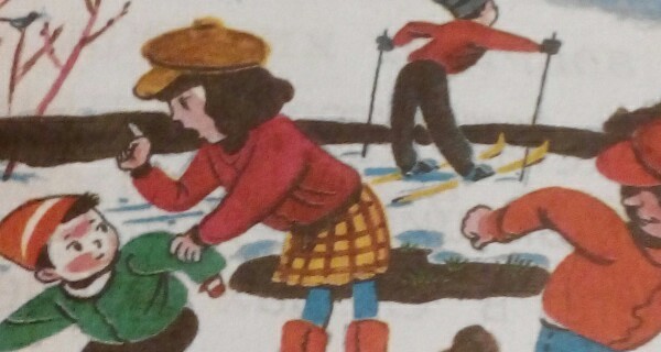 В этот зимний день все ребята в нашем доме вышли погулять на детскую площадку. Витя катался на своих лыжах, а Саша бежал к своей маме, так как он упал в сугроб и он весь в снегу. А Тоня ругает своего младшего братика Борю, потому что он ушёл из дома гулять без спросу.