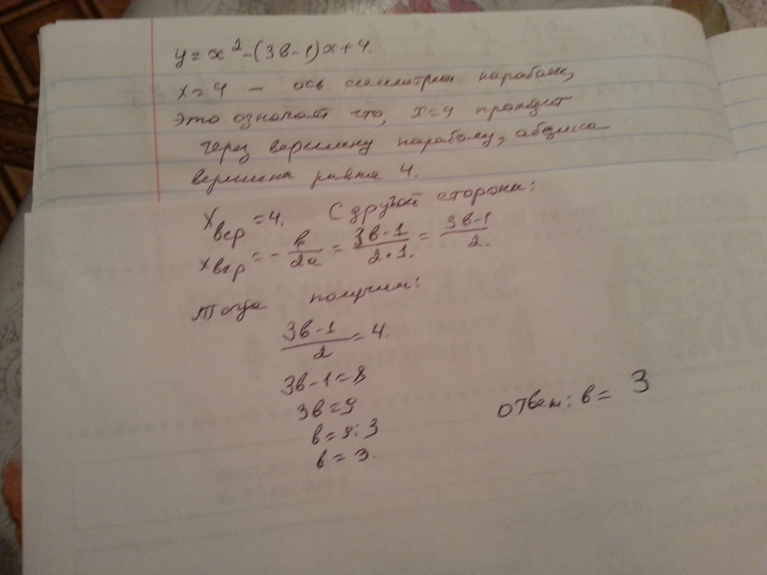Найдите значение коэффициента b , если известно , что прямая x=4 является осью симметрии параболы y=x^2-(3b-1)x+4.