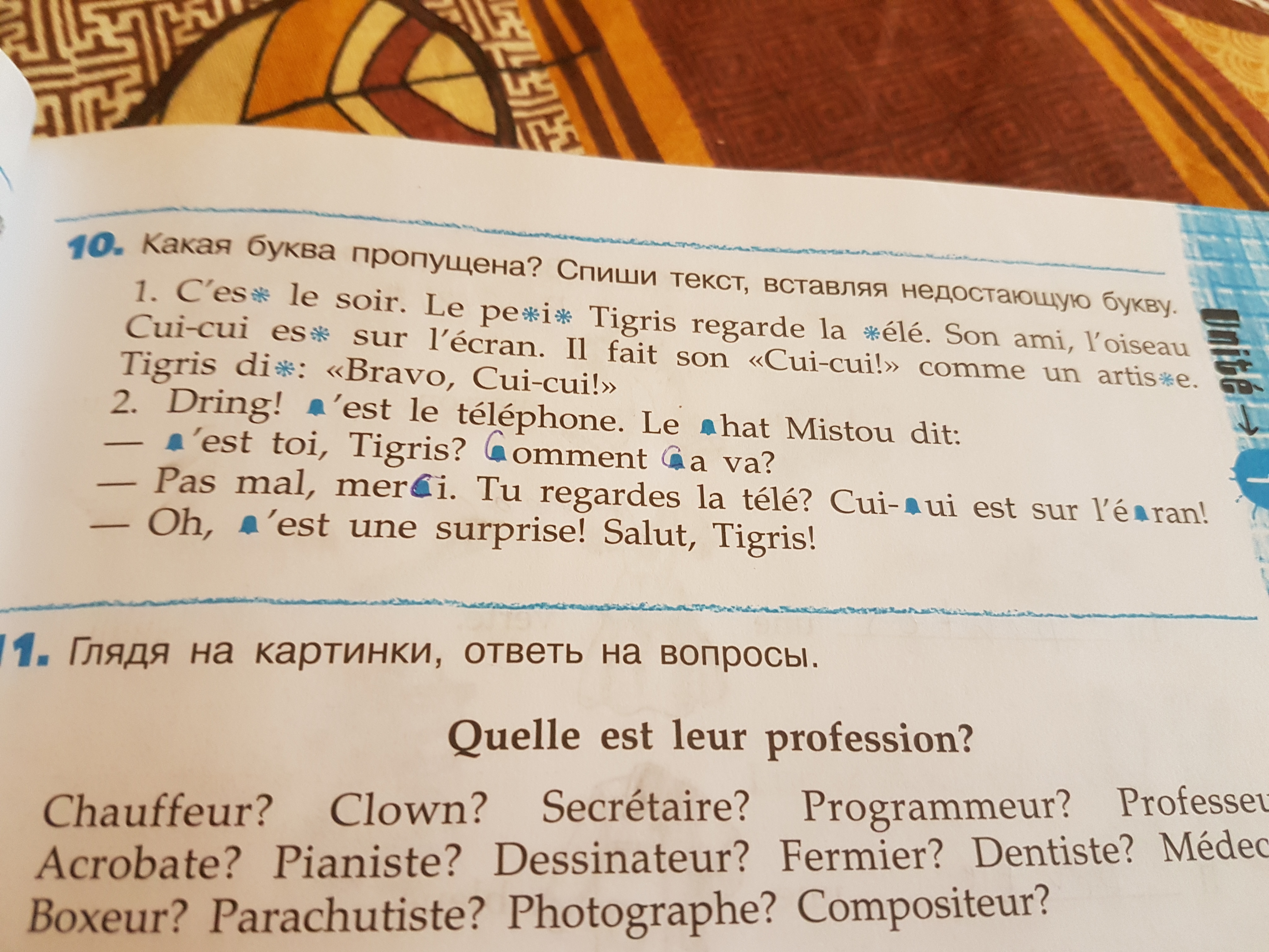 10) a) c'est, le petit, la télé, Cui-cui est, un artiste, Tigris dit; b)c'est, le chat, c'est toi?; comment ça va?, merci, Cui-cui, l'écran, c'est une...;