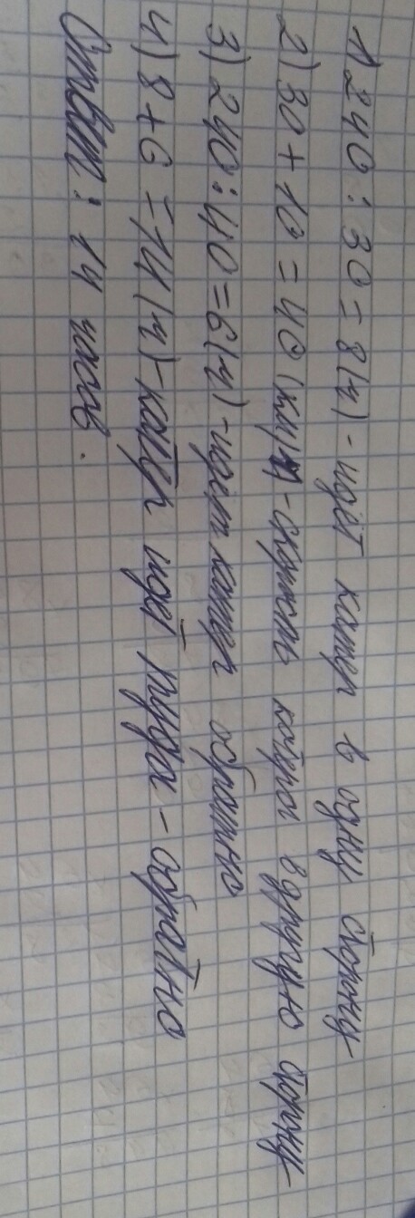 катер идет от одной пристани к другой со скоростью 30 км в час а возвращается обратно со скоростью на 10 км в час больше за кокое время катер пройдет весь путь туда и обратно если растояние между пристанями 240 км в час