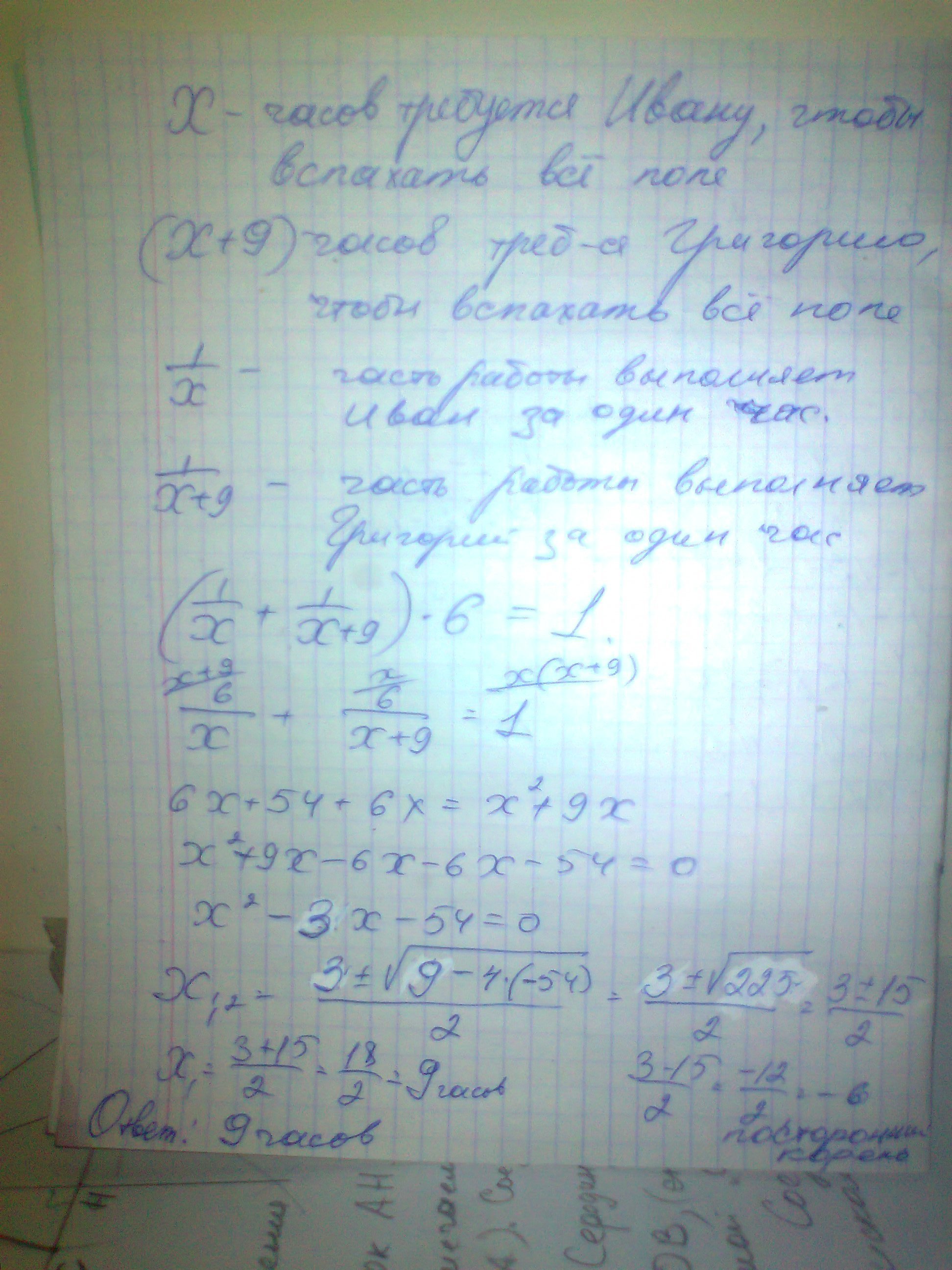 Два землепашца Иван и Григорий могут вспахать поле за 6 часов. За сколько часов Иван может вспахать всё поле, если Иван всю работу может сделать на 9 часов быстрее, чем Григорий?