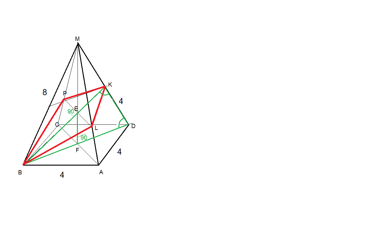 ЕЩЁ СРОЧНЯК!!! В правильной четырехугольной пирамиде MABCD с вершиной M стороны основания равны 4, а боковые ребра равны 8. Найдите площадь сечения пирамиды плоскостью, проходящей через точку B и середину ребра MD параллельно прямой AC.