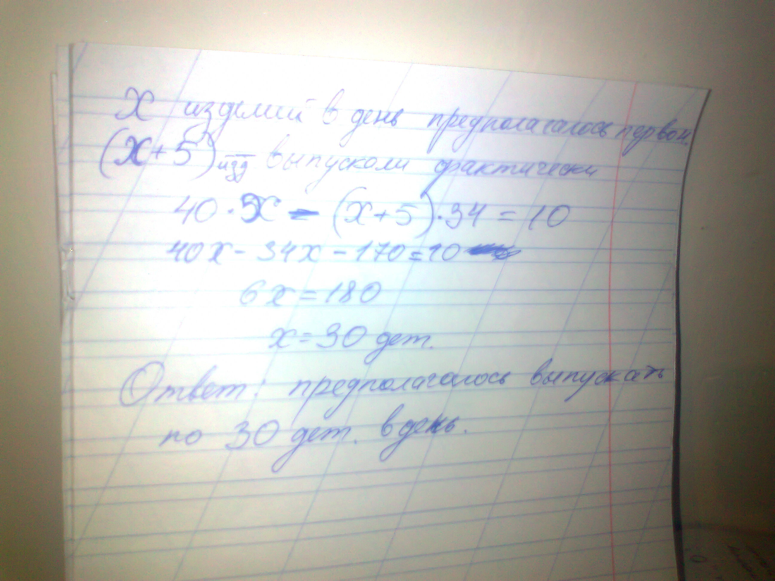 Фабрика предполагала выпустить партию изделий за 40 дней,однако она выпускала ежедневно на 5 деталей больше,поэтому за 6 дней до окончания работы осталось выполнить 10 деталей.Сколько изделий в день предпологалось выпускать первоначально?