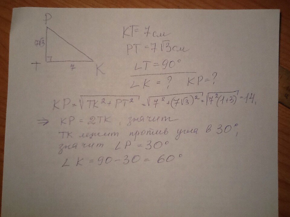 2.В прямоугольном ΔPKT (угол T=90°), KT=7 см, PT=7√3 см. Найдите угол K и гипотенузу KP.