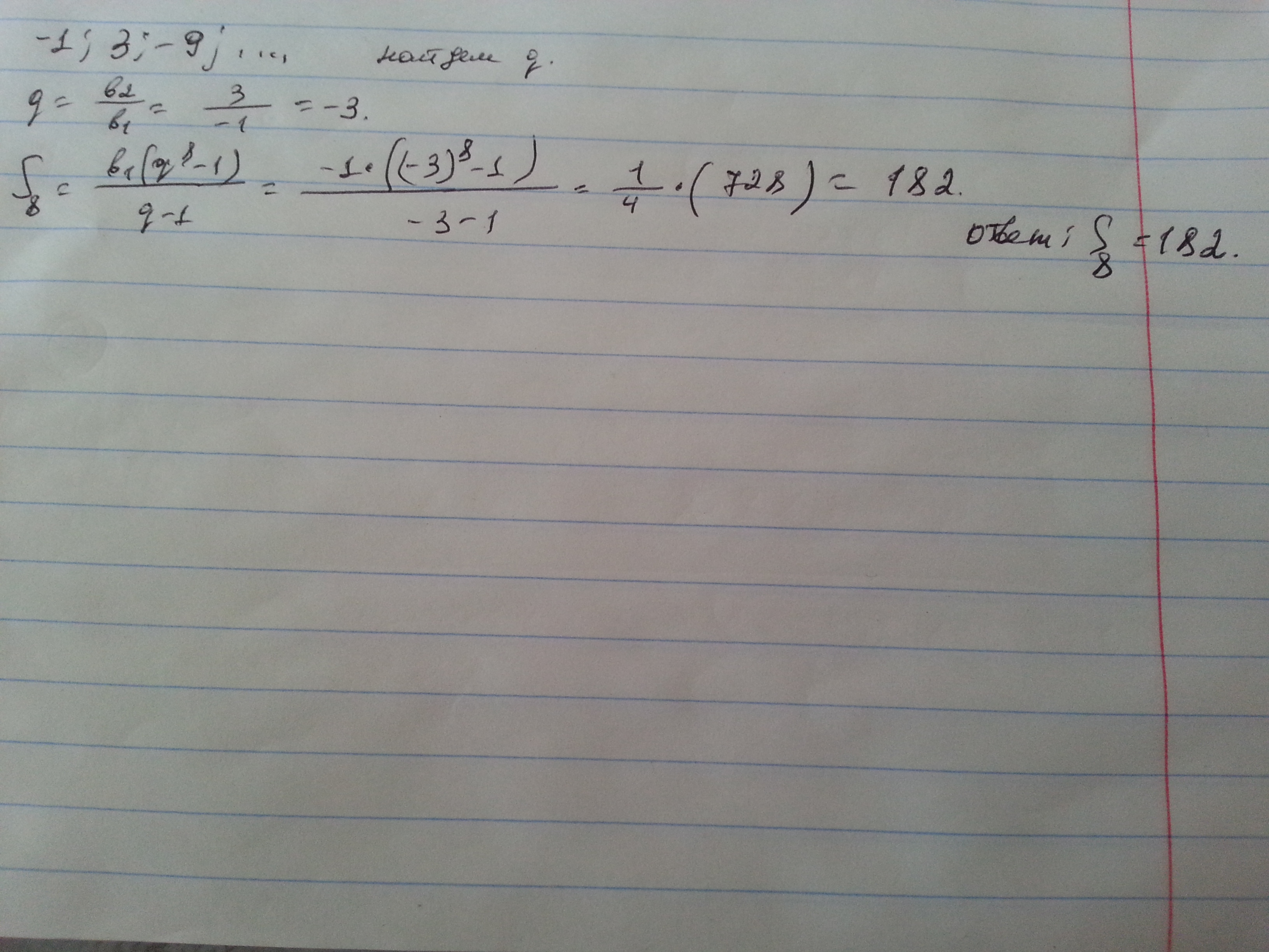 Дана геометрическая прогрессия (bn):-1;3;-9;...Найдите сумму первых восьми её членов.