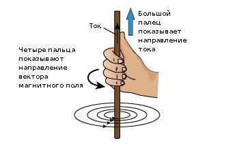 Поэтому обхватываешь правой рукой проводник так,чтобы большой палец был направлен по " направлению тока ". Четыре пальца загибаешь и они обозначают направление магнитного поля.