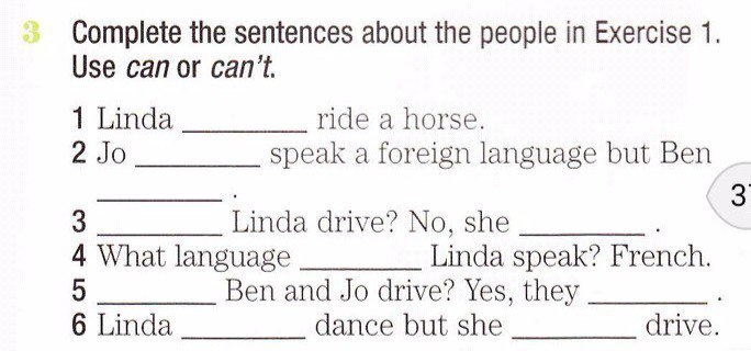 1. can 2. can, can't 3. can, can't 4. can 5. can, can 6. can't, can