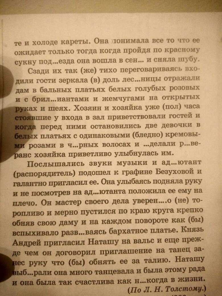 Послышались звуки музыки,и адъютант(распорядитель) подошел к графине Безуховой и галантно пригласил её. Она, улыбаясь, подняла руку и, не посмотрев на адъютанта, положила ее на плечо. Он, мастер своего дела, уверенно, неторопливо и мерно пустился по краю круга, крепко обняв свою даму, и на каждом повороте как бы вспыхивало,развиваясь,бархатное платье.Князь андрей пригласил Наташу на вальс, и еще прежде чем он договорил приглашение на танец, занес руку, чтобы обнять ее за талию.