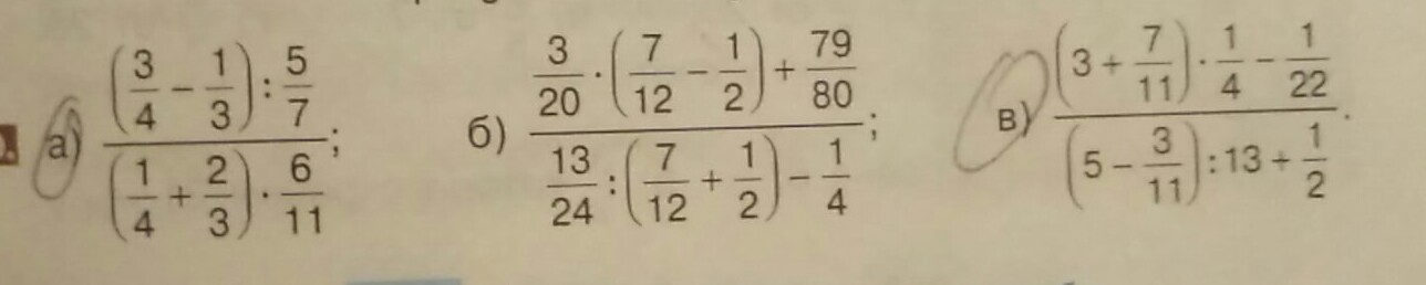 под а (3/4-1/3):5/7 делённое на (1/4+2/3)*6/11=(9/12-4/12):5/7 делённое на (3/12+8/12)*6/11=5/12*7/5 делённое на 11/12*6/11=7/12 делённое на 6/12=7/6