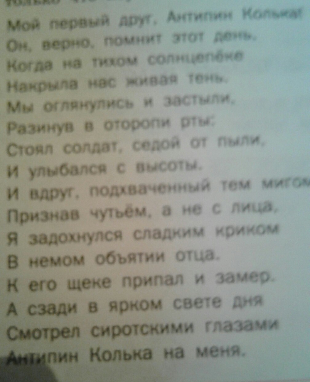 Смысл стихотворения-сын почувствовал,а не узнал отца,которого не видел несколько лет.Сердце мальчика подсказало,что солдат-это его отец,который вернулся домой.Живой,запылённый долгой дорогой,но самый родной и близкий.Возвращение отца домой,долгожданное,но неожиданное,радость встречи,счастье мальчишки.