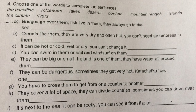 1 - rivers 2- deserts 3-the climate 4-lakes 5-islands 6-volcanoes 7-borders 8-mountain ranges 9-the coastline