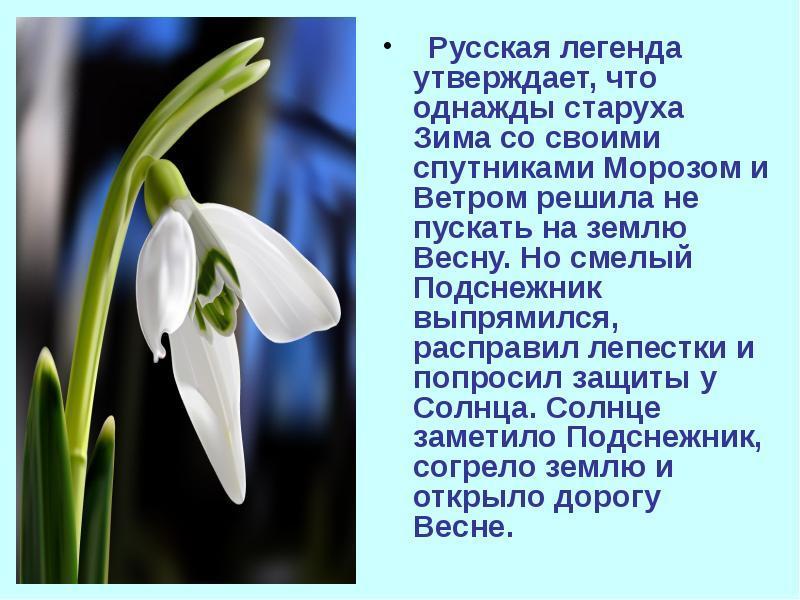 Подснежник это красивый цветок, который вырастает весной.Эти беленькие цветочки так вкусно пахнут.Они самые первые цветы, которые вырастают из под снега в начале весны.19 Апреля -день подснежников.На нем можно увидеть много , много людей с разными видами подснежников.раньше считалось, что подснежник это эмблема надежды.Есть даже легенда про эти цветы.