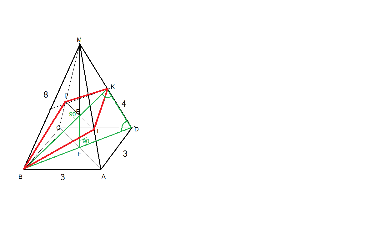 В правильной четырехугольной пирамиде МАВСD с вершиной М стороны основания равны 3,а боковые ребра равны 8. Найдите площадь сечения пирамиды плоскостью,проходящей через точку В и середину ребра МD параллельно прямой АС