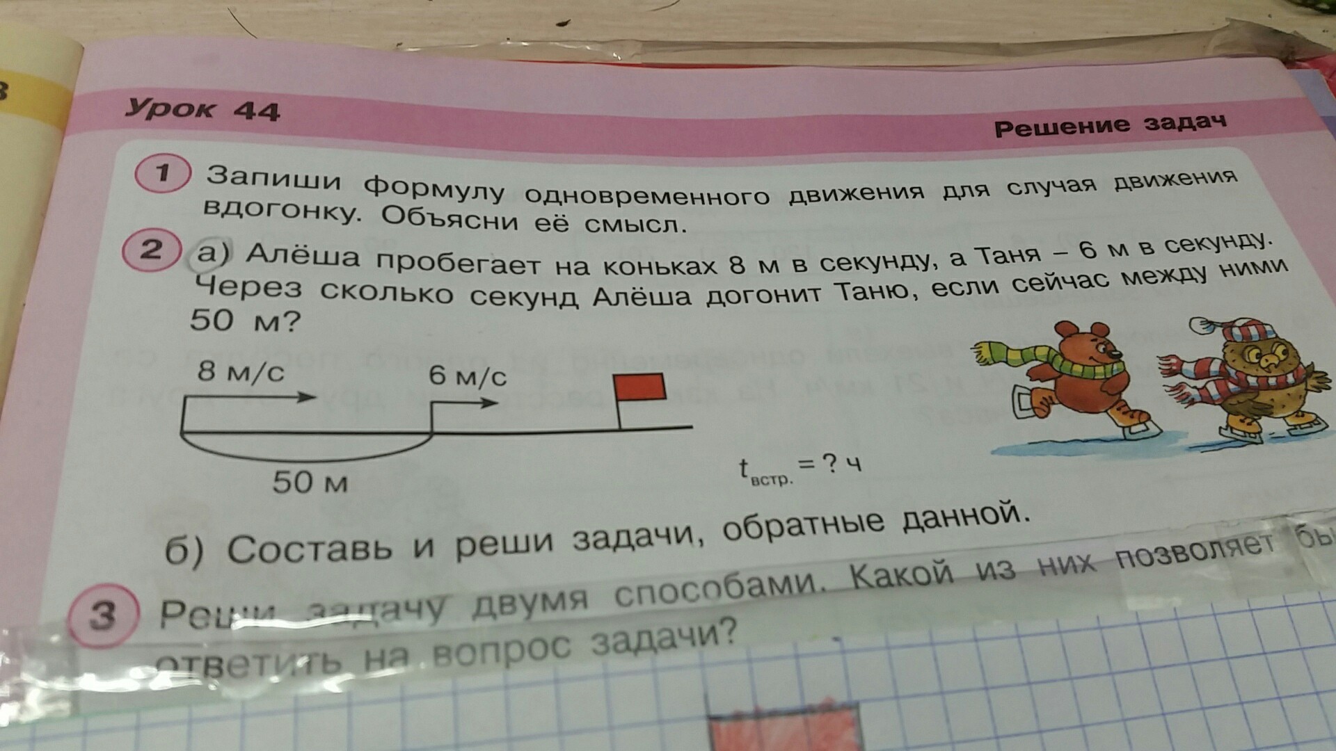Алеша пробегает на коньках 8 м в секунду а аня 6 метров секунду Через сколько секунд Алёша догонит Таню если сейчас между ними 50 м?