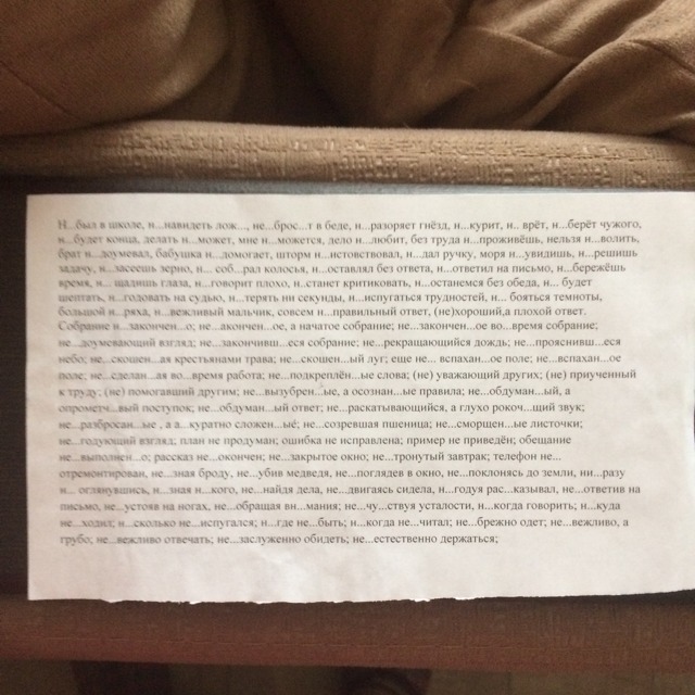 Не был в школе, ненавидеть дождь, не бросит в беде, не разоряет гнезд, не курит, не врёт, не берёт чужого, не будет конца, делать не может, мне неможется, дело не любит, без труда не проживёшь, нельзя неволить, брат недоумевал, бабушка недомогает, шторм неистовствовал, не дал ручку, моря не увидишь, не решишь задачу, не засеешь зерно, не собрал колосья, не оставлял без ответа, не ответил на письмо, не бережешь время, не щадишь глаза, не говорит плохо, не станет критиковать, не останемся без обеда, не будет шептать, негодовать на судью, не терять ни секунды, не испугаться трудностей, не бояться темноты, большой неряха, невежливый мальчик, невежливый мальчик, совсем неправильный ответ, не хороший ответ, а плохой ответ.
